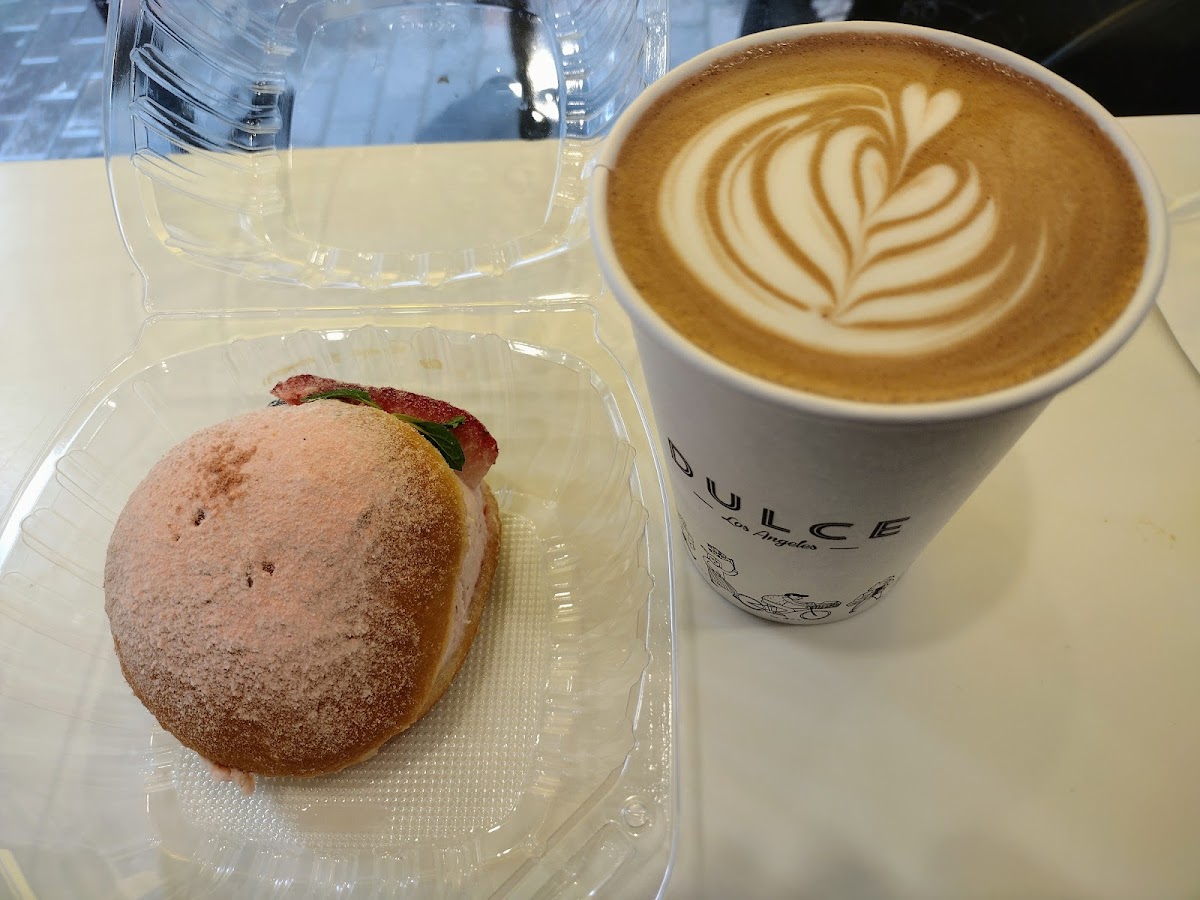 Our to-go cafe if we're in the Little Tokyo area. We tried hot chocolate, blueberry matcha and Hong Kong tea latte before. All were excellent and not too sweet or diluted by milk. The highlight of this cafe is the baked goods. We liked the strawberry cream puff a lot! They have donuts and cake slices too that are popular. Overall, would recommend everyone stop by if you're in the area.